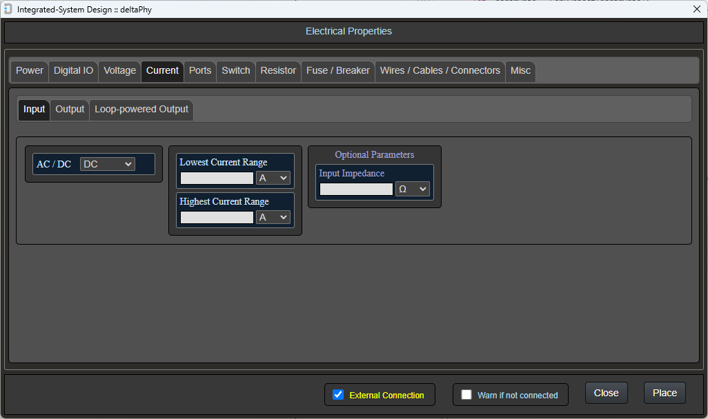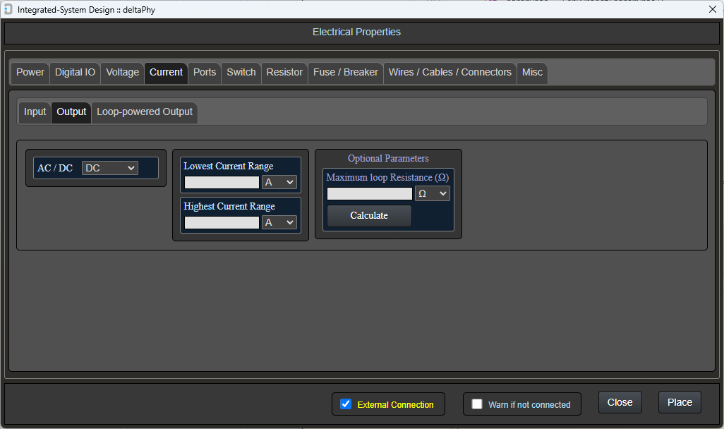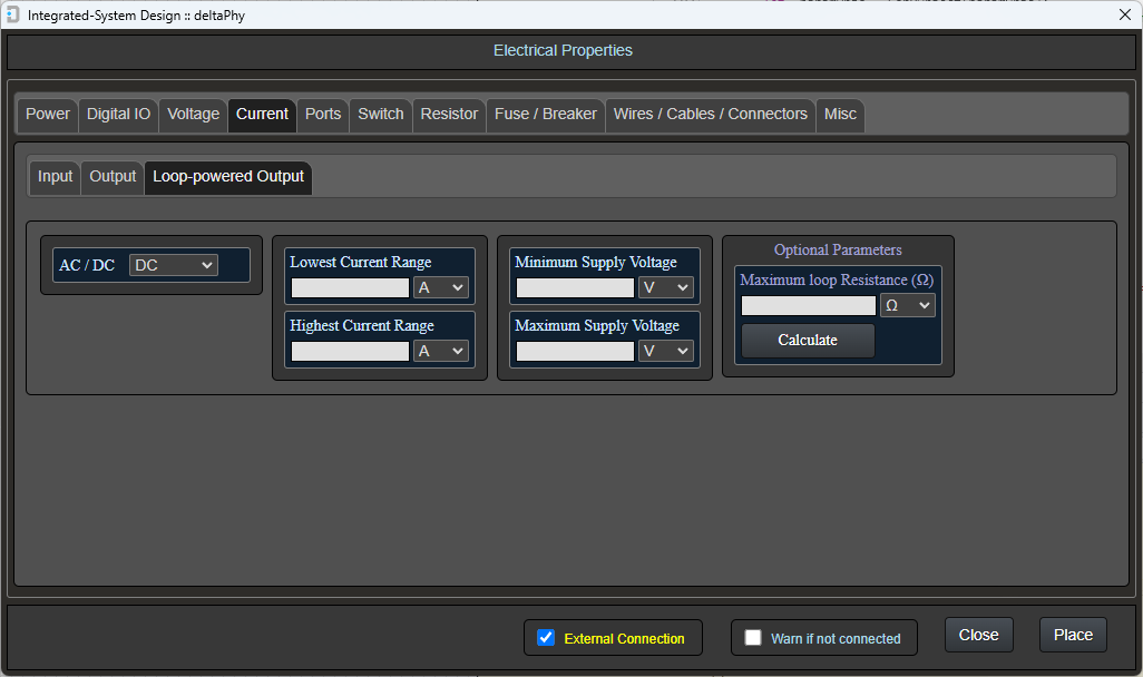 The Loop-powered Current Input object has a minimum and maximum current output range, a minimum and maximum voltage input range and an optional Maximum Loop Resistance value.
