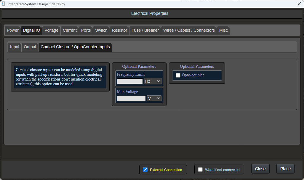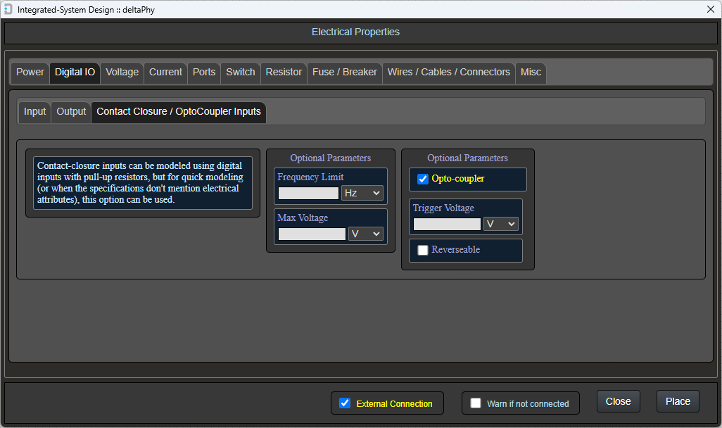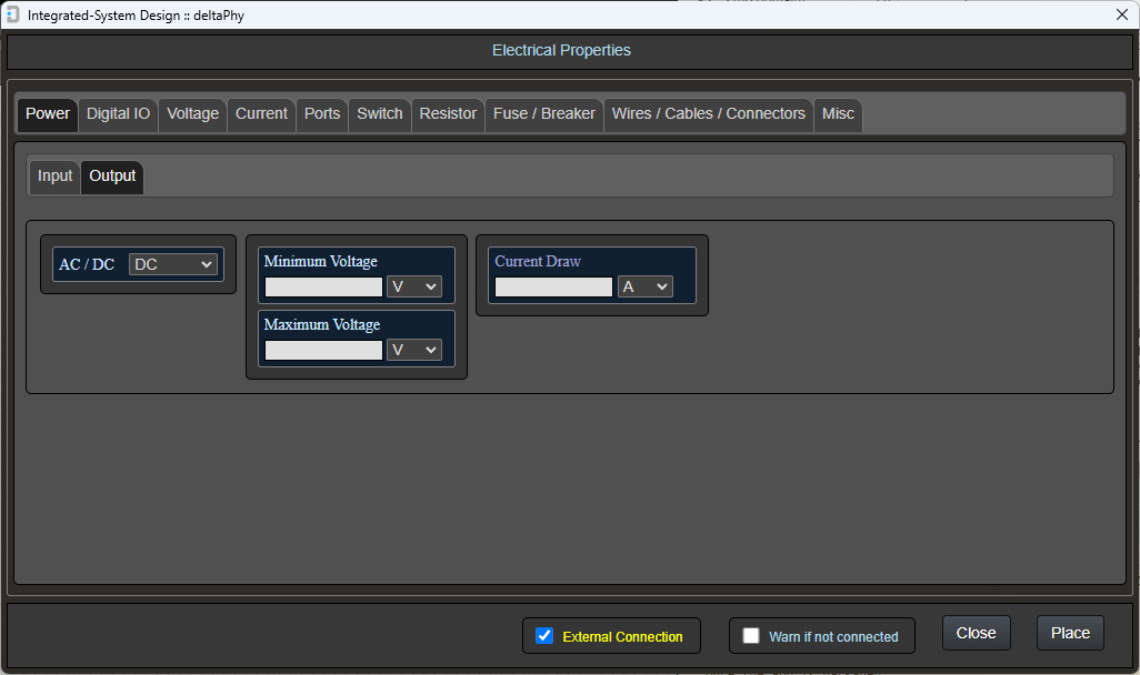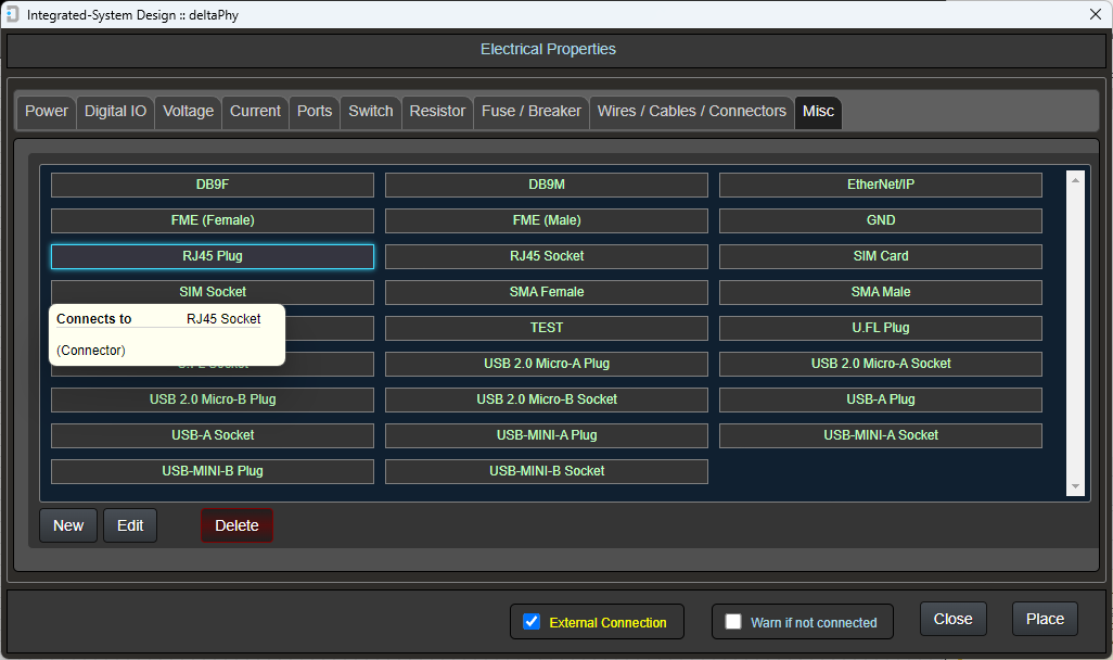 The Warn if not connected configuration option can be applied to any electrical object including communication ports and miscellaneous objects.