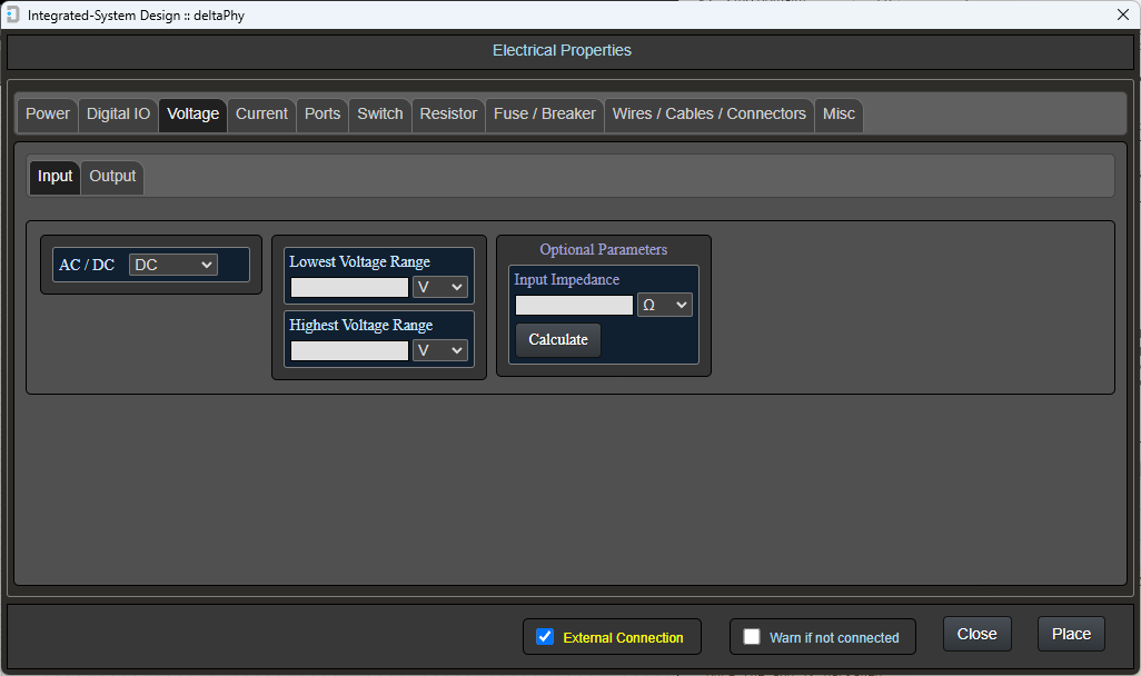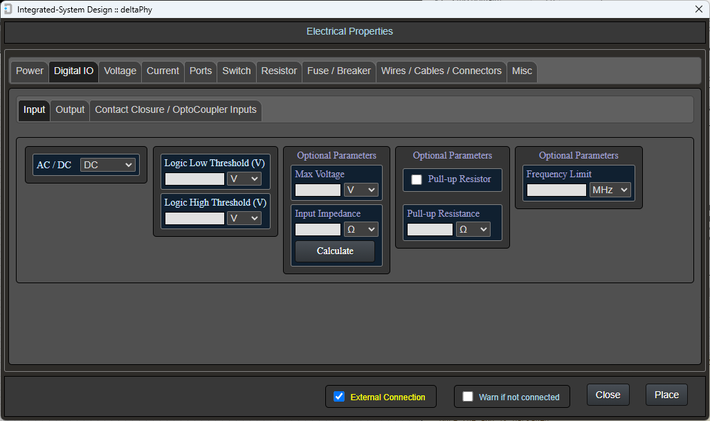 Other parameters can be defined, if known, such as Maximum Voltage, Input Impedance, whether the input has a pull-up resistance, and if so, what it's value is (if known).