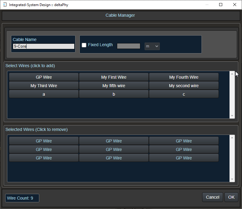 The Select Wires (click to add) section contains all wires defined in your resources. Clicking any of these wires will add them to the Selected Wires (click to remove) section. Clicking any of these will remove them from the cable.