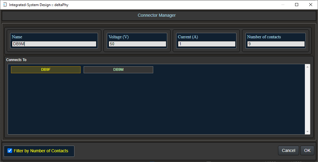 Editing a DB9M connector object. It connects to an DB9F connector.