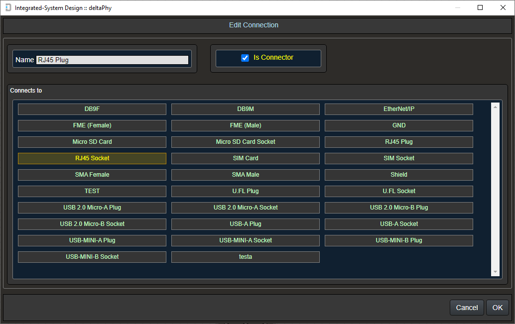 You can select whether the object is a connector or not also. We use a Miscellaneous objects to depict SMA plugs, RJ-45 Plugs and sockets etc.