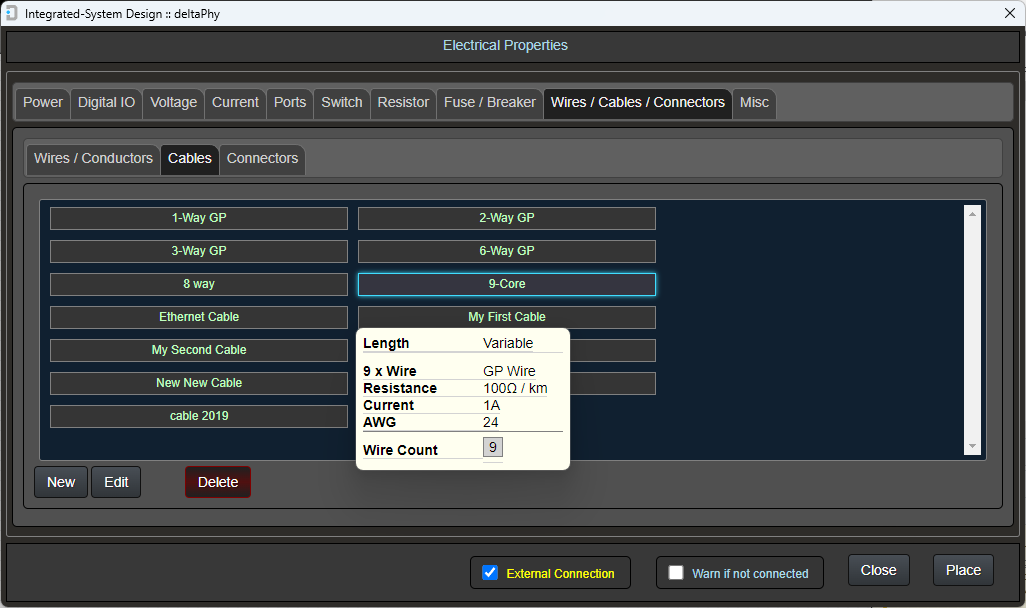 You can define the Wire Name, Wire Resistance (per km or per ft), Max Current and AWG for the wire.