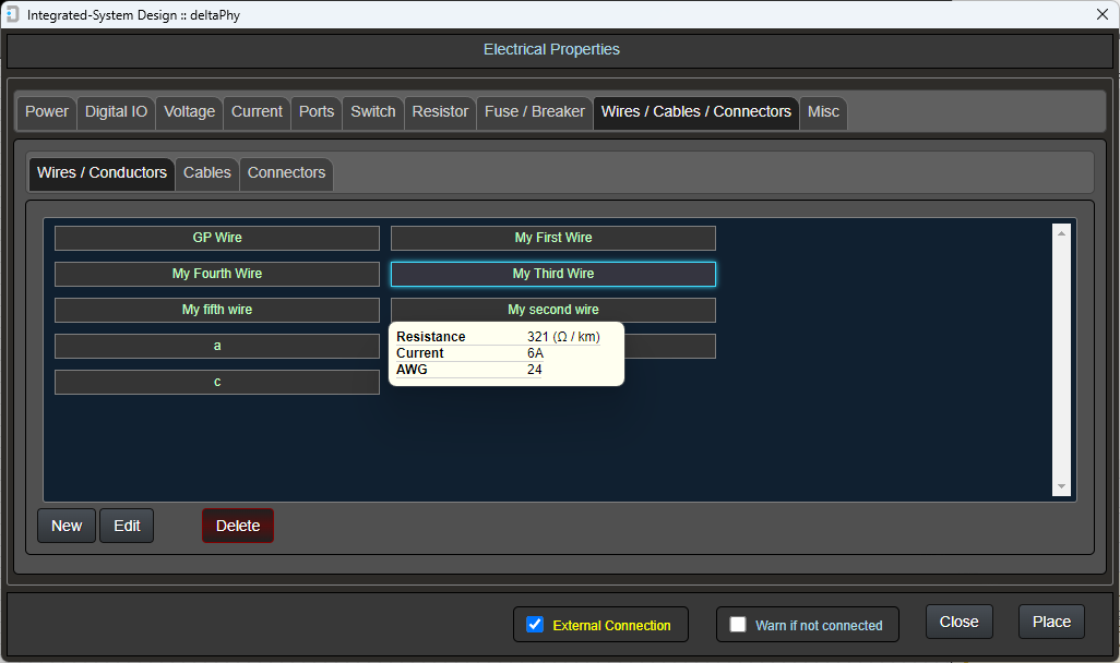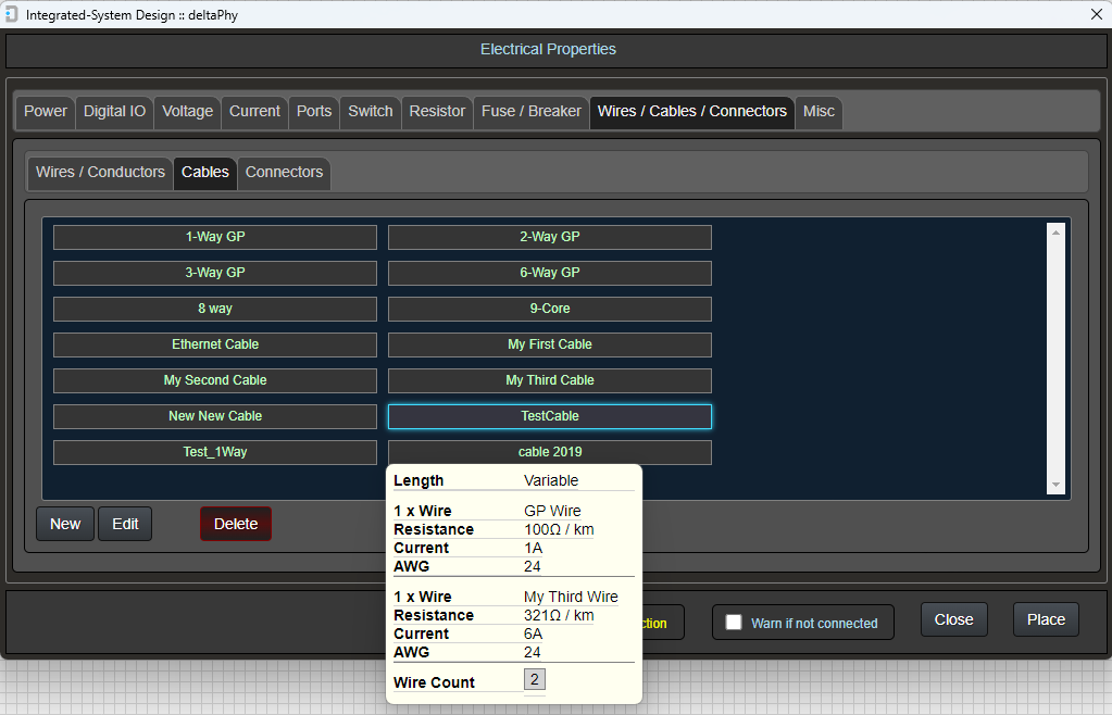 Note: The wires in this image were created for testing. You can add wires you use with correct amperage and AWG properties.
