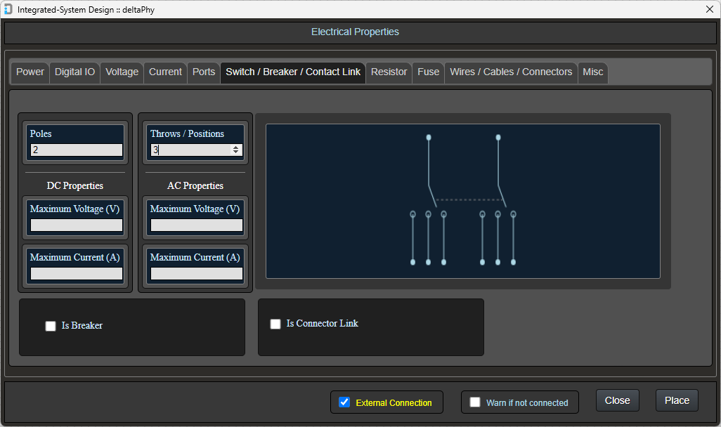 Here you can configure the maximum voltage and current rating and the number of poles / throws.