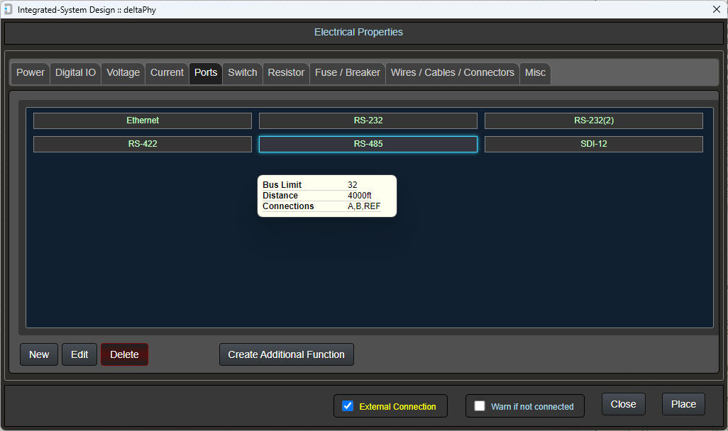We used a Miscellaneous electrical object as an RS-232 port on our DT-80 logger model. The Guidance system recognised it as a port and indicated other compatible ports with the same name (RS-232).