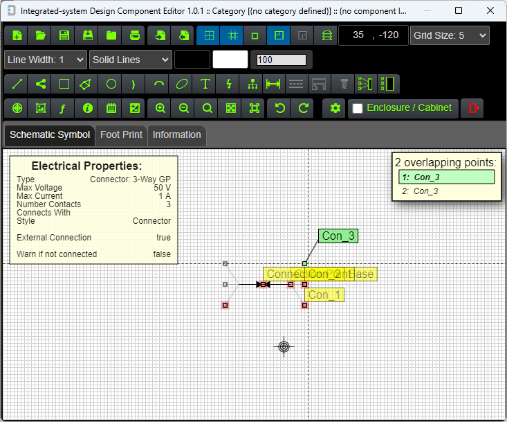 When the 'Connection Points' are touching, hovering the mouse over 'Con_3' shows that the corresponding connection in the other connector is now connected. The Overlapping Points list shows this connection.