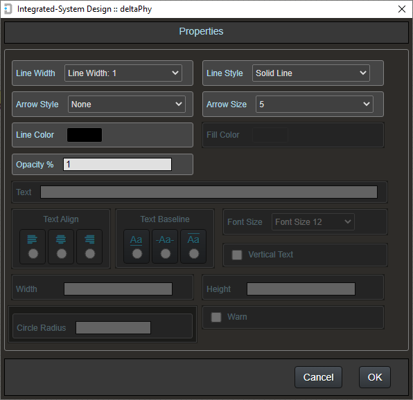 The properties dialog allows various attributes of graphic objects to be changed.